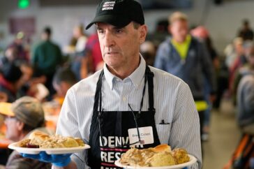 Vrijwilligerswerk tijdens de feestdagen en daarbuiten Vrijwilligers zoals Brent Cohen bezorgen maaltijden aan gasten tijdens de jaarlijkse dankmaaltijd bij de Denver Rescue Mission op 22 november 2023 in Denver. Op…